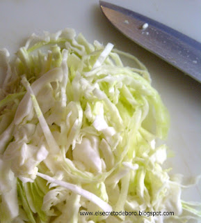 mientras macera el lomo, cortamos en juliana la col, unos ajitos tiernos y una cebolleta